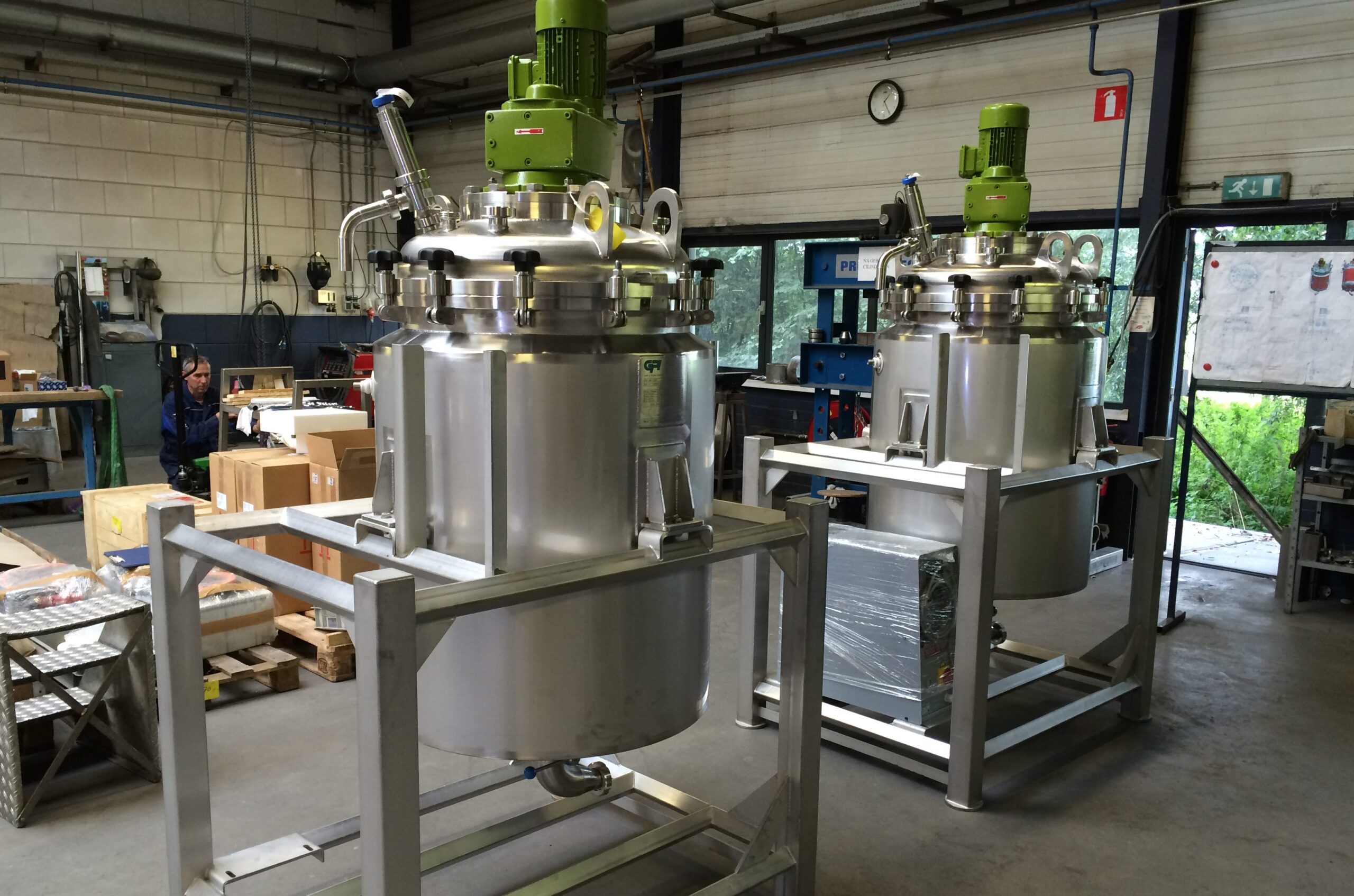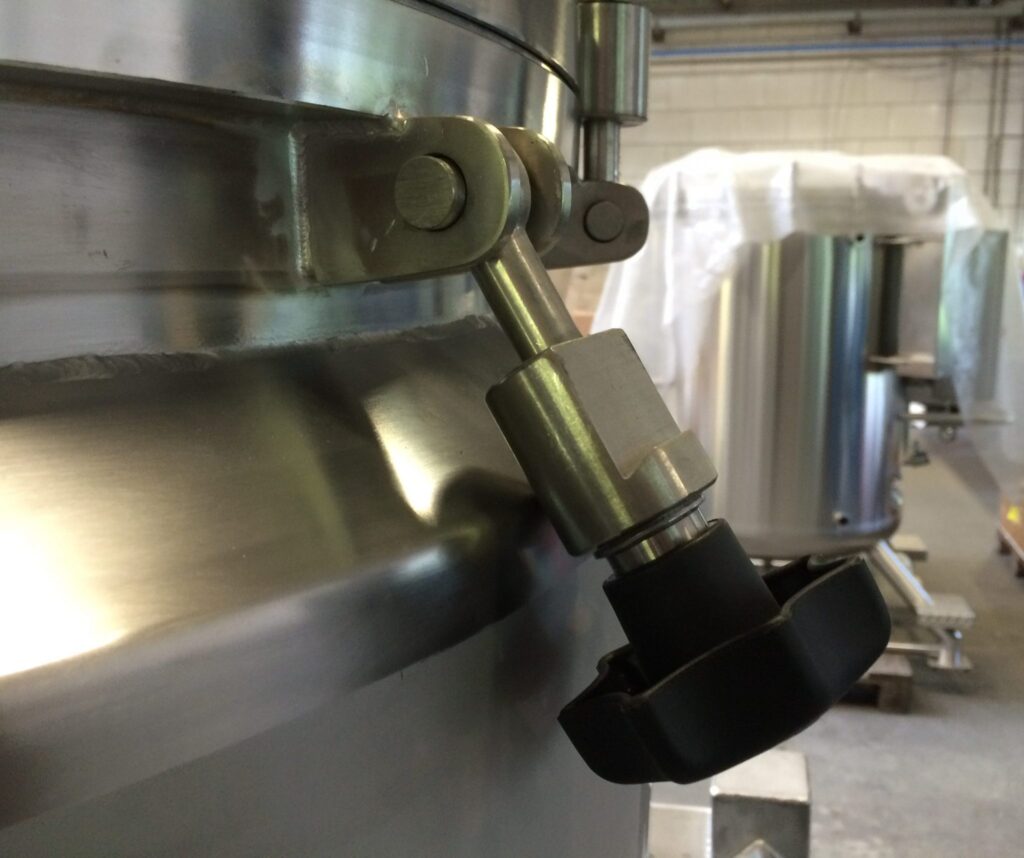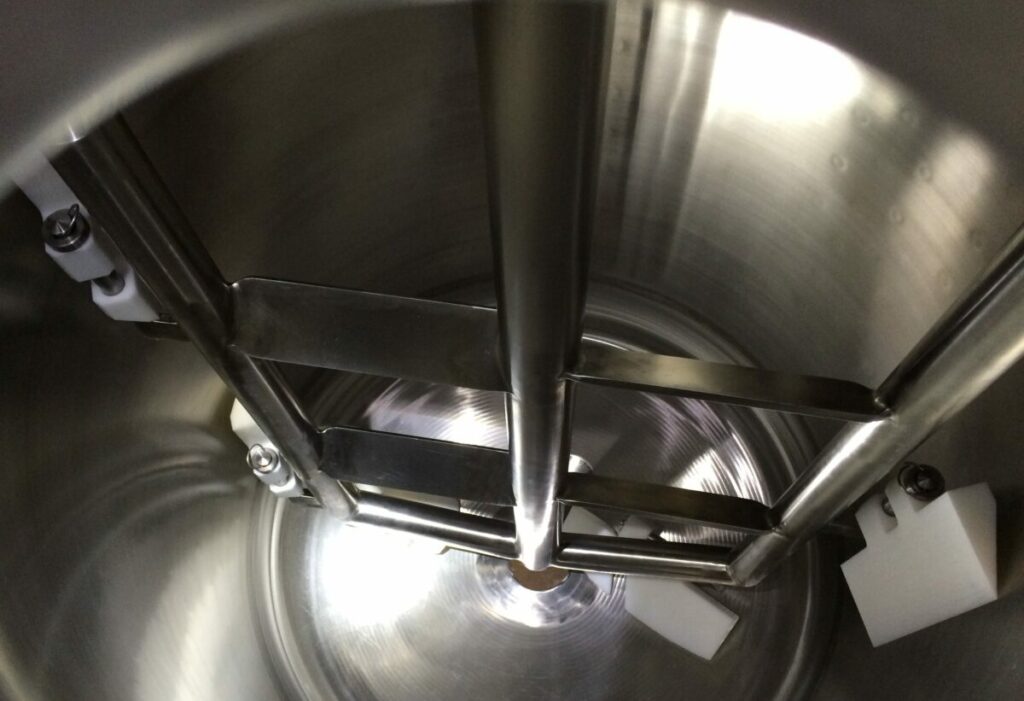 Gpi produzierte vier Tanks mit einem Durchmesser von 70 Zentimetern, einer Höhe von ungefähr 90 Zentimetern und einem Inhalt von 350 Litern. In Rücksprache mit dem Rührwerklieferanten wurde die Mischkonfiguration und die Tankausführung bestimmt und durchgerechnet. Auffallend hierbei ist, dass man sich für einen gewölbten Boden anstelle eines konischen Bodens entschieden hat, wie bei den schon vorab gelieferten (ungerührten) Tanks. Diese Form sorgt nämlich für eine bessere Mischfunktion bei den spezifischen Zutaten des Produkts. Das (Anker-)Rührwerk hat demzufolge eine derartige Form, dass es das Produkt in Richtung des Tankventils befördert. Durch Herstellung eines Überdrucks im Fass kommt das Produkt einfach aus dem Tank. Die Tanks sind entleerbar und im Tank sind Sprühkugeln montiert, die jede Stelle im Tank besprühen können.